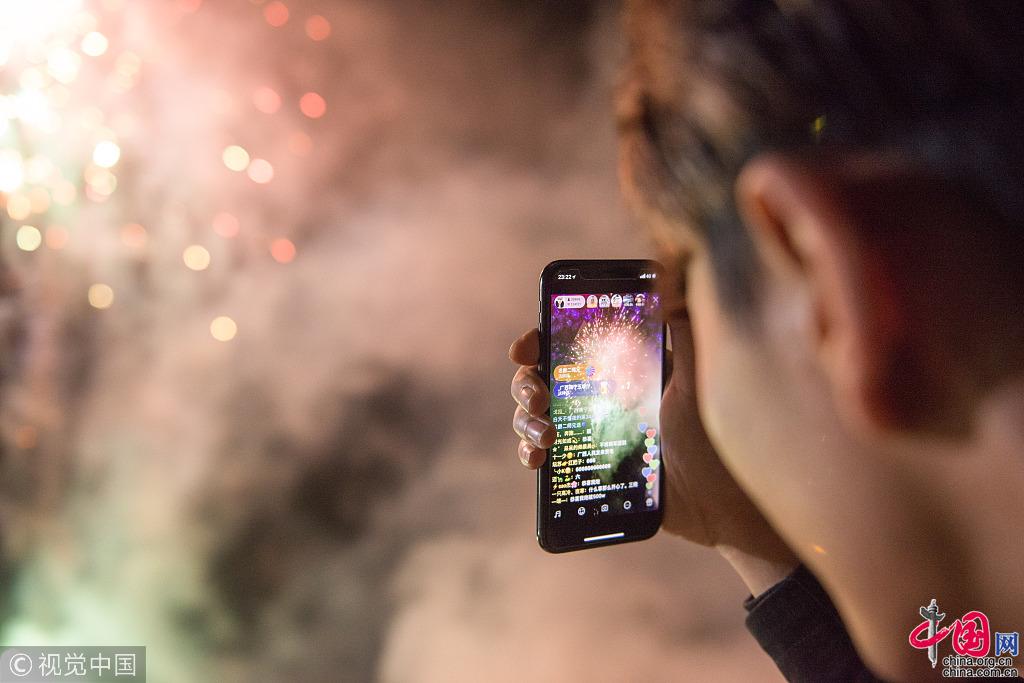 广西南宁上林县塘红乡堆寒庄,网红“三炮”在给粉丝直播放烟花。腾起的烟花照亮了大山中的整个村庄。喝醉了的“三炮”在烟花下跳舞,他自豪自己是全村的希望。村里,以留守老人和中年人居多,大多以种地为生,年轻人在15岁左右大都辍学外出打工了。“三炮”也不例外,在14岁那年,他辍学离开村子,和朋友一起到广东闯荡。图片作者:Chin Chen/视觉中国