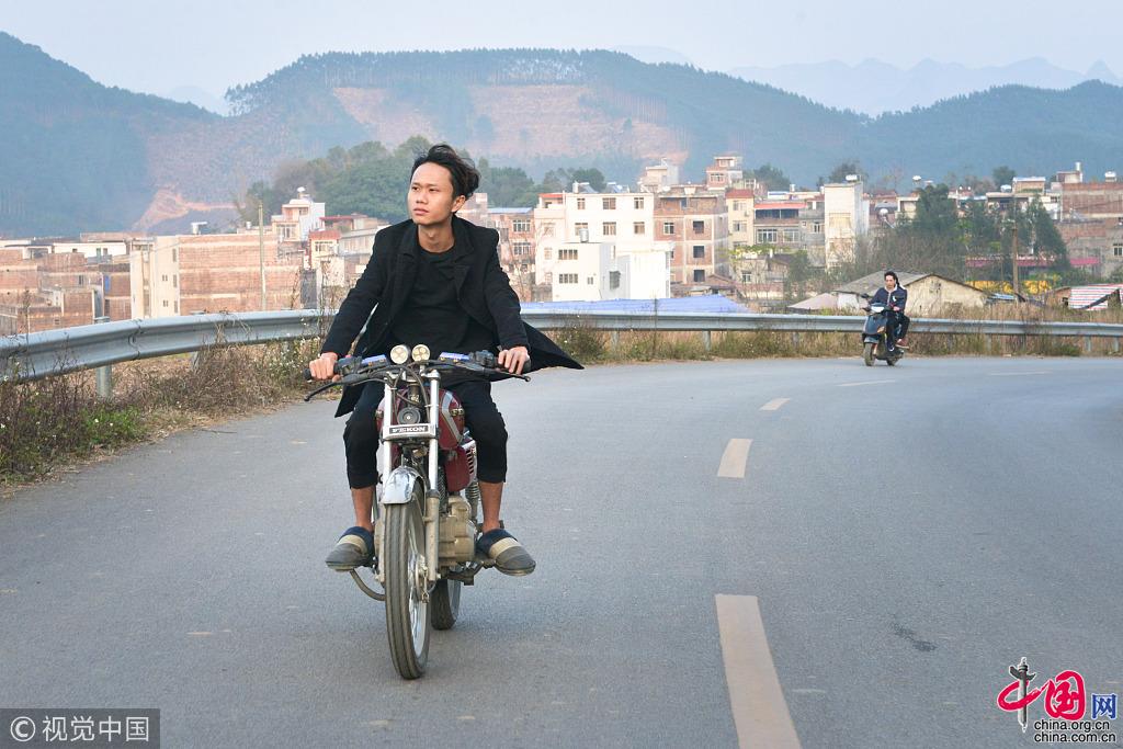 “三炮”骑着他的125摩托车行驶在公路上,这是村子通往外界的唯一的途径。十个月的打工生活,“三炮”不仅没赚到钱,还欠下8000多元的债。2016年春节前,“三炮”为了省下两百块,和朋友开着自己的125摩托车回家。骑了600多公里,开了大约15个小时,回乡路途上的艰险让“三炮”下定决心,离开工厂,不再打工。图片作者:Chin Chen/视觉中国