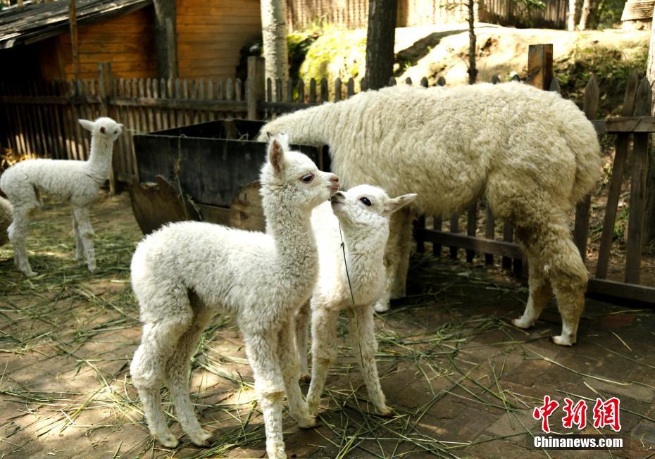 7月13日,两只小羊驼共同进食。近日,青藏高原野生动物园里新出生的三只南美洲华卡约羊驼繁育成活。这也是该物种首次在有世界“第三极”之称的青藏高原诞生并育活。中新社记者 马铭言 摄