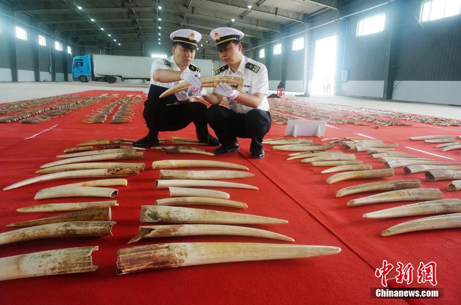 7月17日,哈尔滨海关发布消息,中国北疆哈尔滨海关驻虎林办事处破获一起特大走私濒危动物制品案件,一次性查获涉嫌走私羚羊角、猛犸象牙、海象牙等,案值突破1亿元人民币,系中国海关近年来一次性查获走私濒危动物制品数量最多的一起案件。图为海关工作人员清点记录濒危动物制品数量。中新社发 哈尔滨海关供图