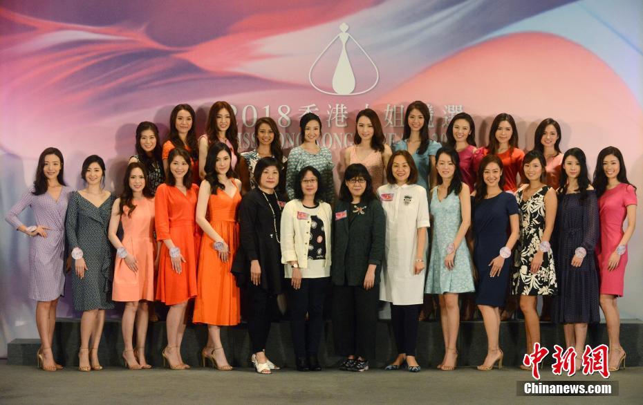 7月19日,“2018香港小姐竞选”二十位候选佳丽在香港以最优美的姿态首次公开亮相,向媒体作自我介绍,并与无线高层要员等人(前排中4人)合照。中新社记者 邓庆乐 摄