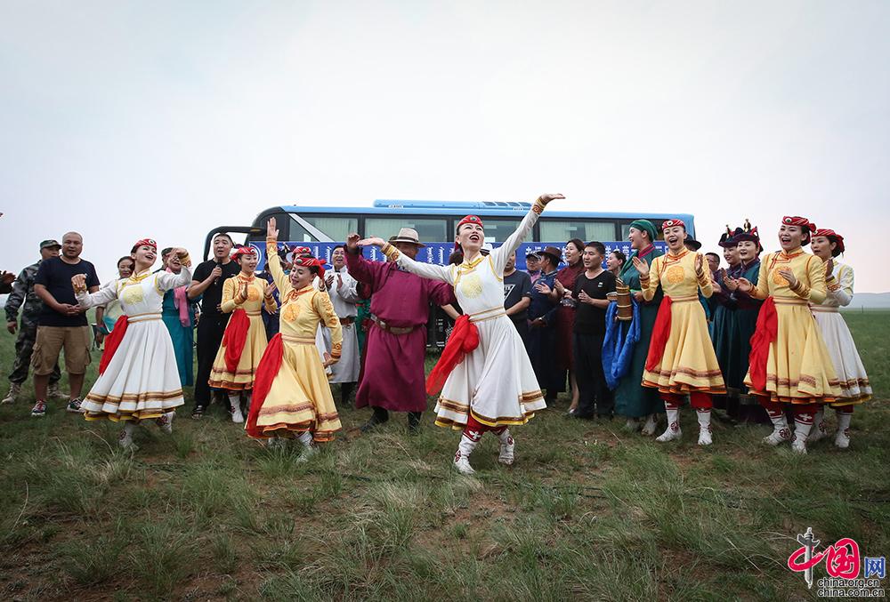 演出结束,队员们与观众一起合影,随后跳起欢快的舞蹈。习近平总书记在给苏尼特右旗乌兰牧骑队员们的回信中,称赞“乌兰牧骑是全国文艺战线的一面旗帜”, 这让队员们备受鼓舞。在广袤的草原上,乌兰牧骑成为一颗耀眼夺目的明珠。中国网记者 伦晓璇 摄