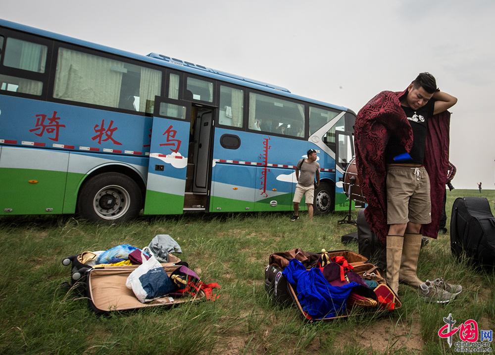 在大巴上,队员们忙着进行演出前的准备。乌兰牧骑长期活跃在牧区和乡间,草原经常就是他们的“化妆间”。中国网记者 伦晓璇 摄