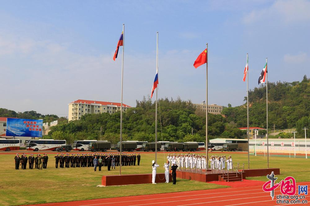 “国际军事比赛-2018”“海上登陆”陆战队分队比赛5支参赛队已抵达赛区。图为升俄罗斯联邦国旗。 摄影 尚文斌