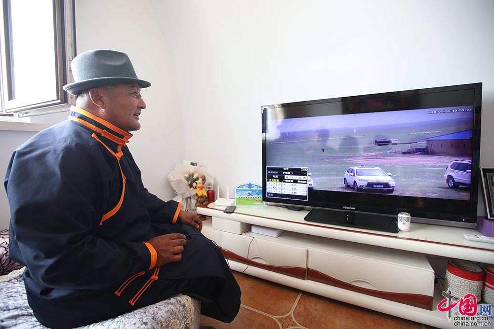 宝力道巴特尔在家中操作鼠标,通过电视屏幕查看屋后草场上羊群的动态。