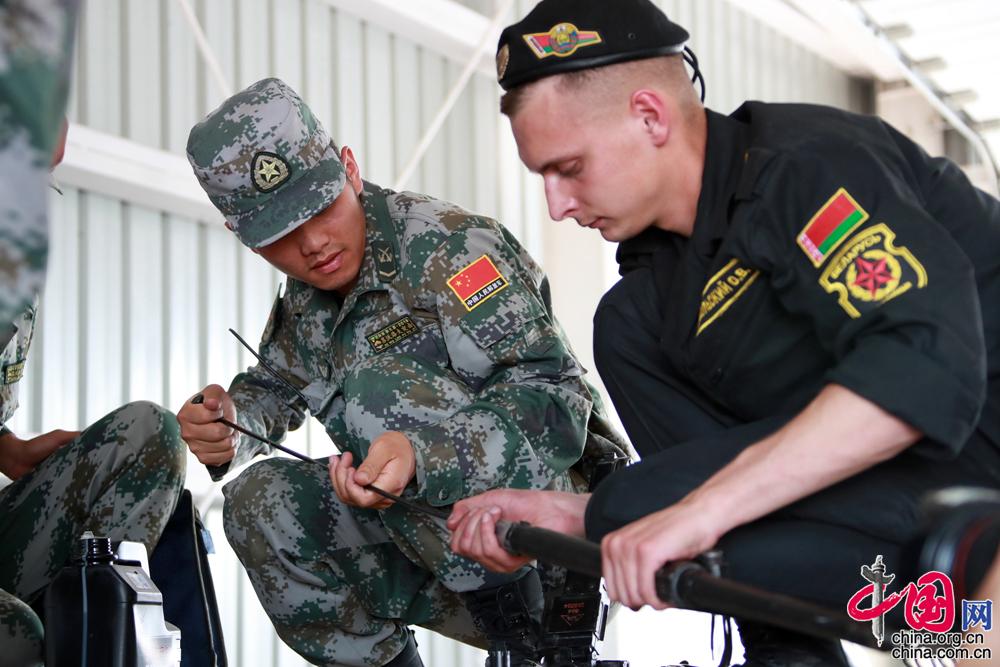 作为外军参赛队的教练员,赵伟曾连续两年参加“安全路线”项目的比武,去年还获得了工兵班组第一的好成绩,经验丰富、技术精湛。像赵伟这样的教练员还有很多,他们活跃在外军的训练场,手把手、面对面地帮带外军参赛队员。据了解,今年的比赛,除“苏沃洛夫突击”项目俄罗斯自带装备外,其他参赛队均使用中方装备,为帮助外军尽快适应比赛场地和熟练掌握中方武器装备,中方邀请了一大批院校专家、技术能手和金牌教练员帮带外军参赛队员,提供优质的理论指导和技术培训,帮助解决外军提出的问题和遇到的困难,尽快度过适应期。