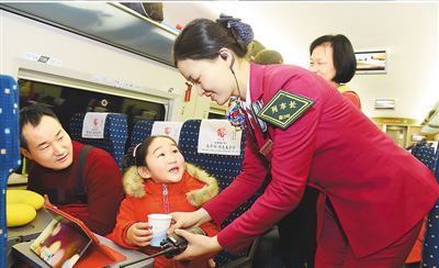 2016年2月6日,南昌铁路局福州客运段列车工作人员廖辉为一名小乘客送去热水。