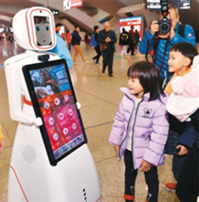 2017年1月13日,在广州南站,小朋友与为旅客提供咨询服务的智能机器人“小璐”互动。