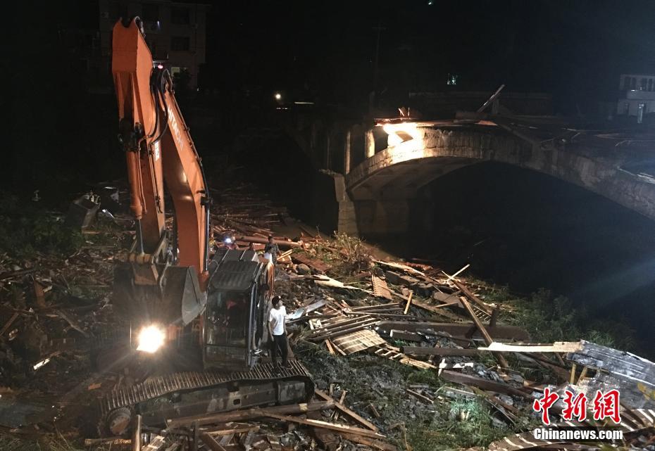 7月27日,各方救援力量正在事故现场进行救援。27日晚19时40分,受强对流天气影响,浙江桐庐县合村乡一座廊桥桥面发生垮塌致使廊桥下乘凉群众被压。截至目前,11人送至桐庐县第二人民医院救治,其中死亡8人,受伤3人。现场处置仍在进行中。中新社记者 钟新 摄