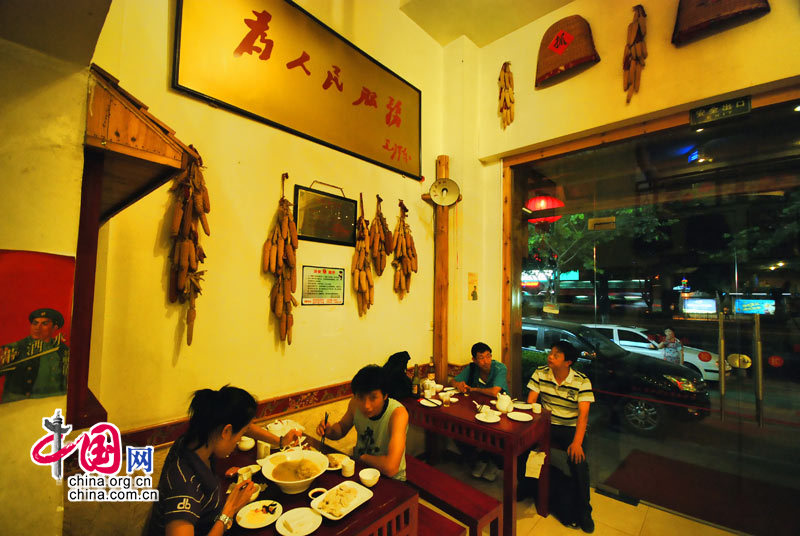 走进老知青饭店,你能感受到浓浓的东北味——墙上挂着发黄的老玉米,有的客人坐在炕上用餐,所售的菜肴也是以东北风味为主,然而这家饭店最有名气最有特色的绝不止这些,光看人家这名字——老知青,兴许您已经能猜出一二来。身着红卫兵服饰的青年男女服务员往来穿梭在坐满食客的饭店里,墙上赫然挂着毛主席思想万岁的宣传画;还有文革时期的旧报纸;一块铜牌匾,上面书写红色的“为人民服务字样”; 还有那些用簸箕做成的“大字报”,上书:大海航行靠舵手的标语映入人们眼帘。整个饭店的风格和服务让人感受到一阵浓浓的“文革风”。