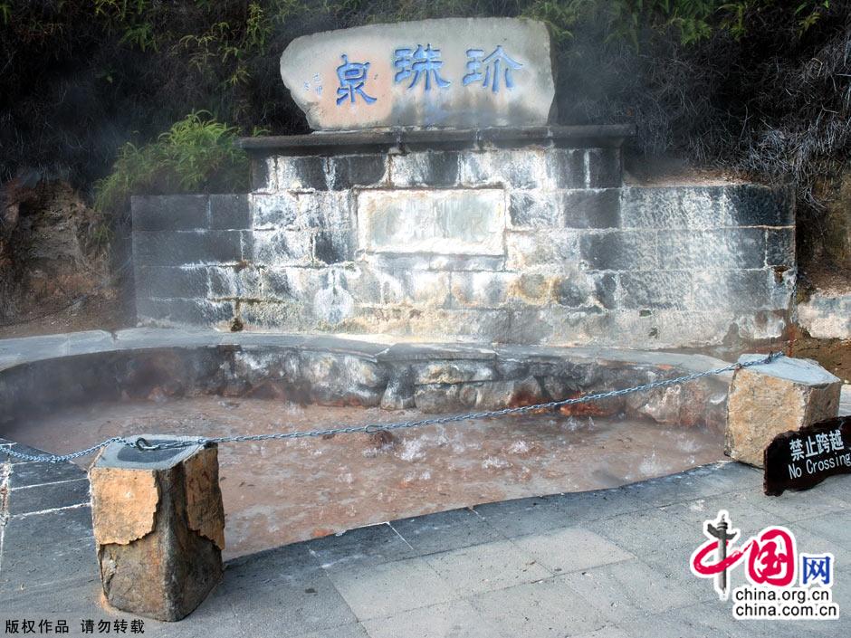 珍珠泉位于云南省保山市腾冲市,为一双泉坑,由众多喷汽孔形成的凝结水坑,二坑位于同一平面上,东坑水温95.5℃;西坑水温88℃,流量0.2L/S。二泉均有喷气孔,硅华毛矾石、铀矿化现象。中国网图片库 郭锐/摄影