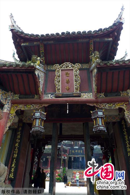 圣寿寺,位于重庆市大足县著名的宝顶山大石刻群内。宝顶山位于大足县城东北十五公里,东距重庆市区一百六十二公里,以摩崖造像驰名世界。它的佛像石刻,数以万计,共有四十一处石刻群。石刻造像始凿于唐景福元年(八九二年),终成于南宋。宝顶、北山为我国晚期石窟艺术的代表作。宝顶山又名「香山」,是由宋朝蜀中名僧赵智凤于公元一一七九年至一一二四年,历七十年建造而成的大型密宗道场,规模浩大,共有摩崖造像万余尊,整个造像犹如展开的横幅长卷图画,造形优美,内容丰富,其中尤以举世无双的千手观音和长达三十一米的卧佛著称。 中国网图片库 郭锐/摄影