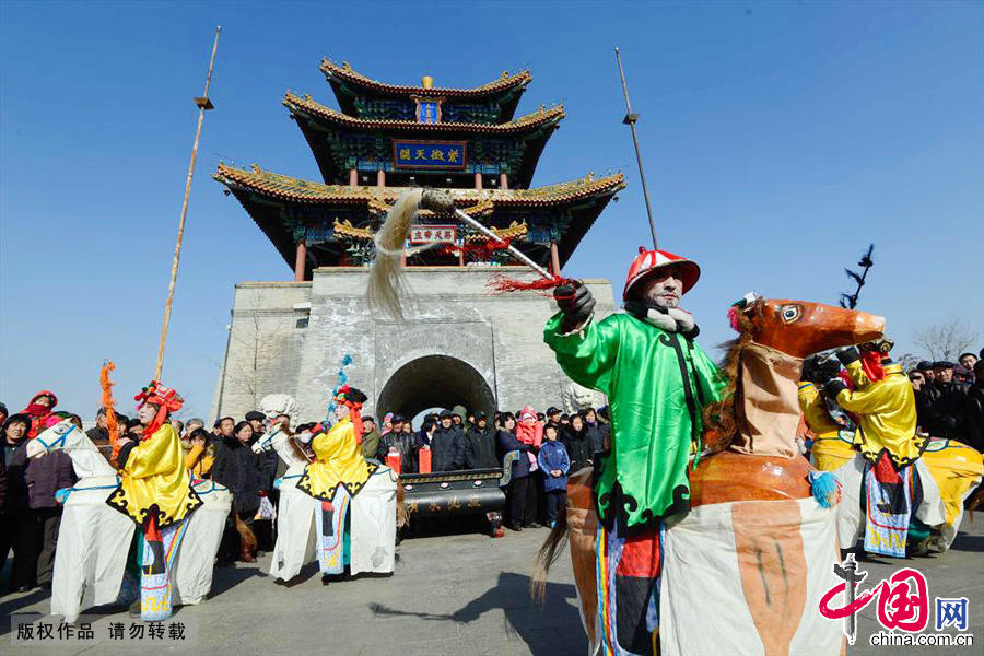 2月13日,京郊延庆县永宁镇南关村的村民纷纷走出家门,在永宁古镇表演跑竹马,庆祝元宵节的到来,永宁镇南关村表演竹马有500多年的历史,非遗项目“跑竹马”已经成为活跃农村文化生活、自娱自乐、创建和谐社会的有效载体。村民在玉皇阁下表演跑竹马,庆祝元宵节。中国网图片库 郑永/摄