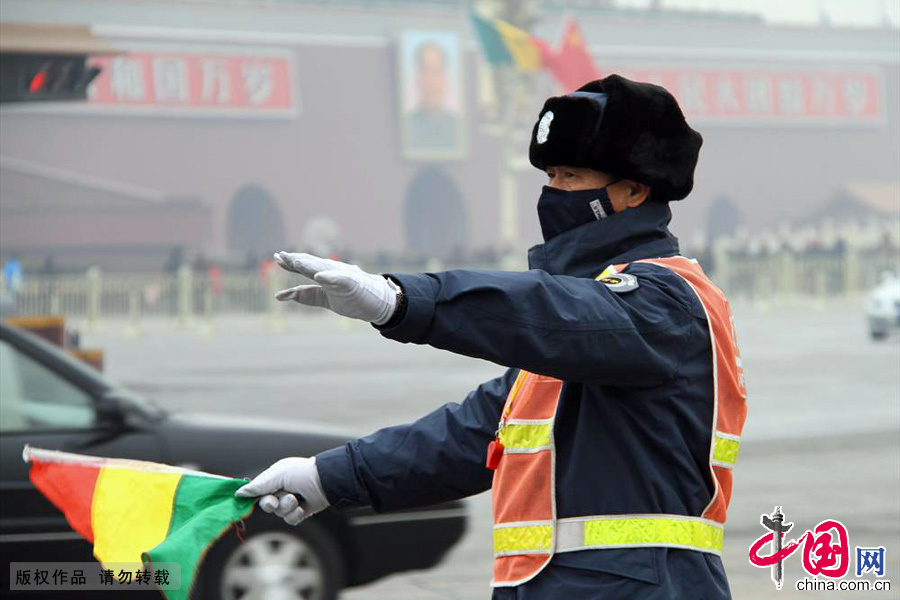 2月22日,北京全城被雾霾笼罩,当日,武警、特警、交通协管员、环卫员等户外工作人员仍然坚守在自己岗位上。图为天安门前交通协管员戴着口罩指挥车辆和行人。中国网图片库 徐经来/摄