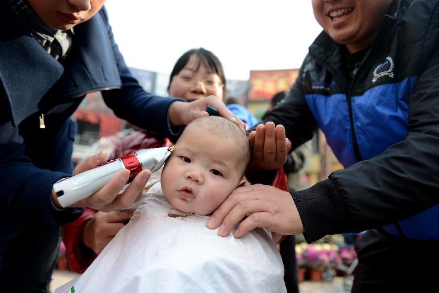 3月2日,在安徽省合肥市罍街广场上,理发师在为孩子剃头。