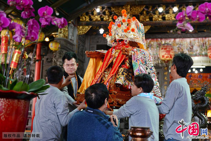 2月20日,台湾省屏东县东港镇东隆宫三年一次迎王祭典,闻名全世界。中午,东隆宫就有不少信徒前往上香祝福,各庙宇的神轿也陆续前往祝福。东隆宫的王爷是东港人的重要信仰,东港人从出生取名到考大学、找工作,都会到东隆宫拜拜,祈求王爷庇佑,东港人的生活与王爷紧密结合。中国网图片库 彭年/摄