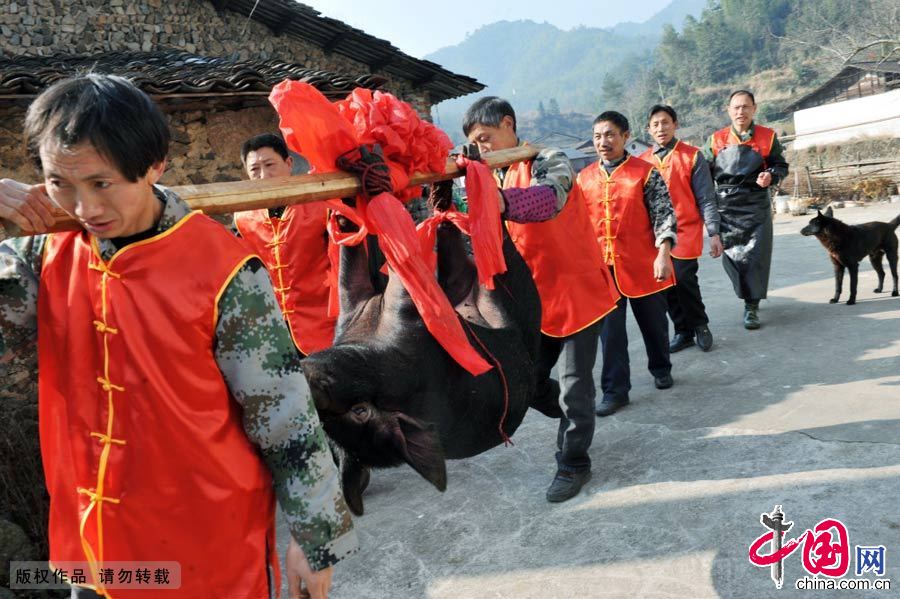 2月7日,江西省广丰县铜钹山镇小丰村村民抬着当天要宰杀的年猪在村里游走,意在邀请乡亲们前来吃“杀猪饭”。中国网图片库 卓忠伟摄影