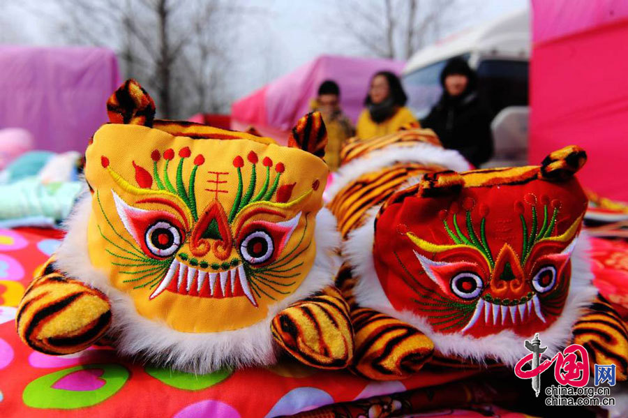 2015年2月7日,山东青岛泊里大集,一对布虎娃娃枕。
