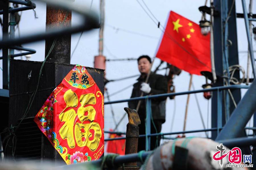 2月16日,山东青岛渔民们陆续来到停泊在积米崖渔港的数百艘渔船上,给渔船换上崭新的国旗,张贴火红的福贴,让渔船焕然一新,与渔船一起欢欢喜喜过大年。中国网图片库 俞方平摄影