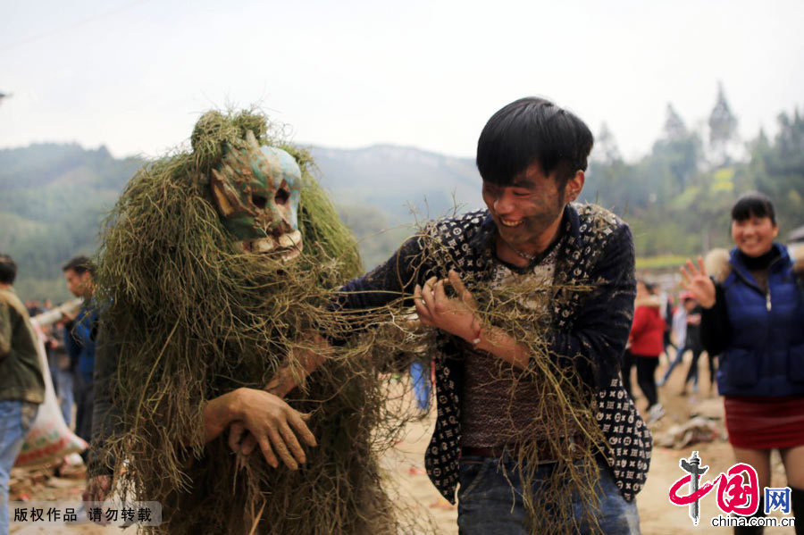 2015年2月27日,在广西柳州融安县安宁村大袍屯举行的“芒篙节”上,装扮成“芒篙”的青年为一名游客抹灰送福。中国网图片库 邓丽婷摄影