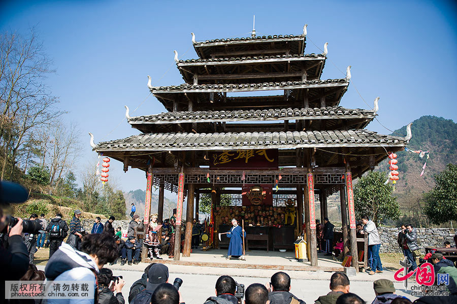 起源于元代、有着600多年历史的侗族傩戏“咚咚推”,如今依旧在湖南省新晃侗族自治县天井寨上演。天井寨,坐落在湖南省新晃侗族自治县东南部的崇山峻岭之中。吊脚木楼鳞次栉比,石墙巷道蜿蜒逶迤,是一处保存颇为完好的古村落。天井侗寨村民们在寨子空地上建了一座“天傩台”,供演傩戏——“咚咚推”之用。 中国网图片库 尹忠 摄