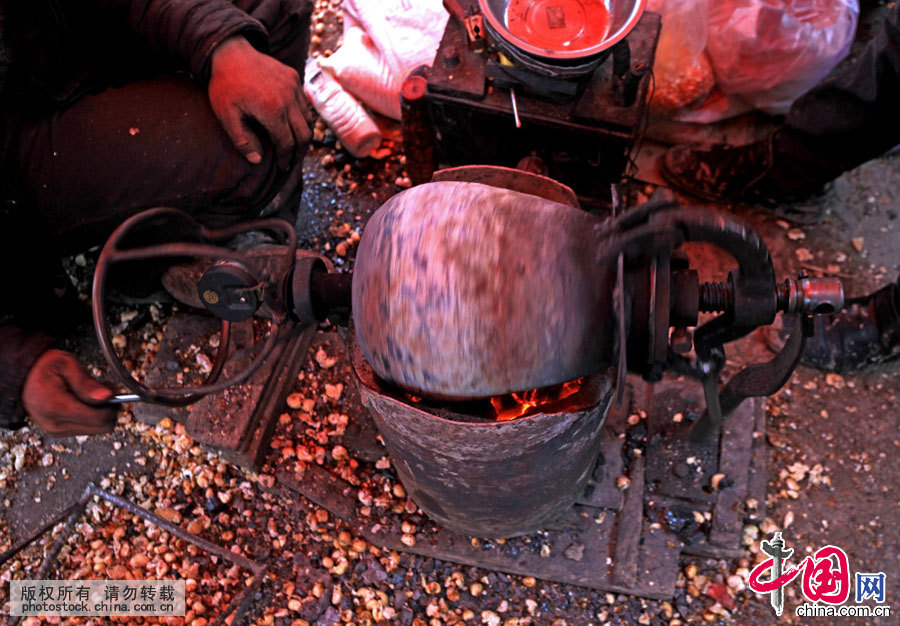 2月1日,贵州安顺,爆米花师傅在进行加工作业。中国网图片库 卢维摄影