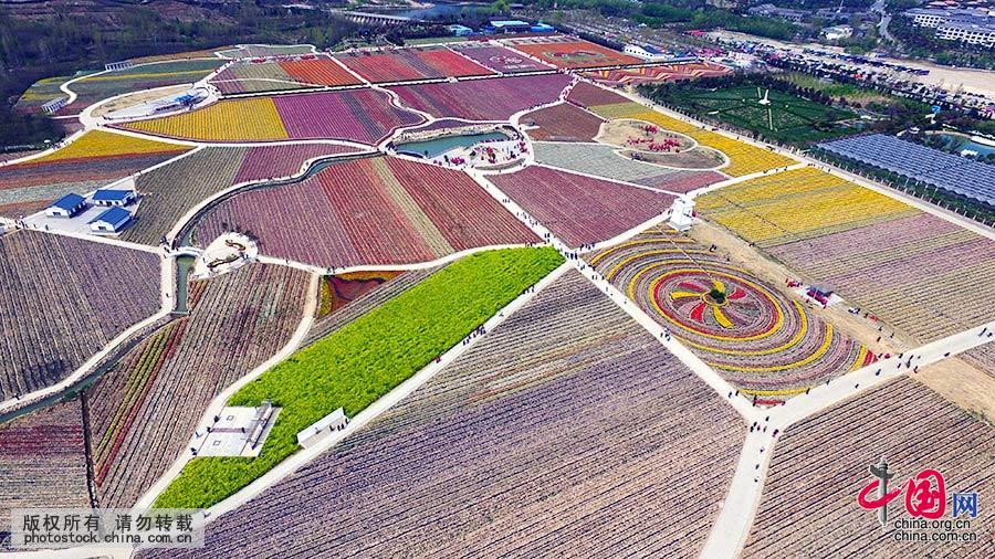 2016年3月31日,航拍河南驻马店一景区千亩郁金香绽放,似彩色地毯。