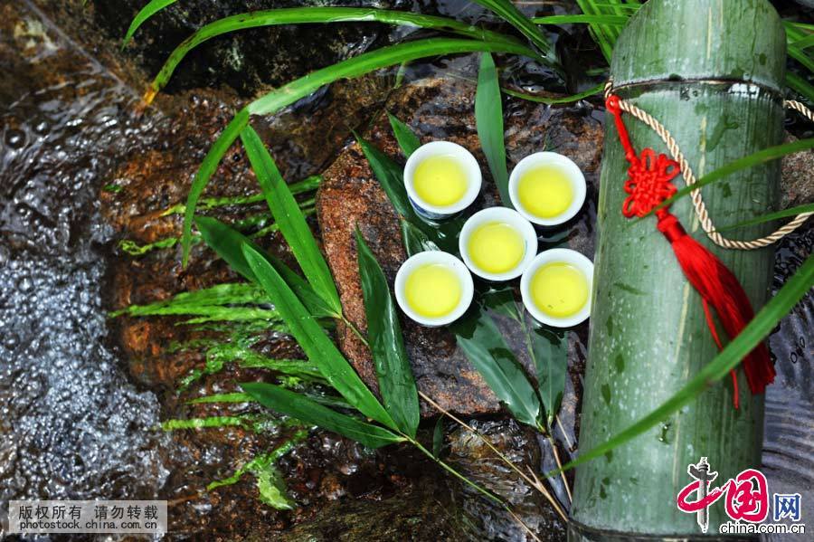 竹子里竟然能“种”出酒来,你能想象得到吗?竹子里面的酒芳香扑鼻,经过长达一年之久的美酒是如何在竹子里“长”出来的呢?这不,在浙江省临安市白水涧村的一处“种酒”基地内就有这样的奇景。如果有顾客需要现场取酒,那么工作人员就会来到“种”酒基地内的竹林,用手来敲击毛竹,耳朵贴近竹竿来识别哪一节竹子内是否有酒。待确定有酒的竹节后,就用工具在竹子上打起孔来,等钻出小孔后,一股微微发黄的液体从孔中流出,带着淡淡竹子青香的酒气迅速向四周扩散。