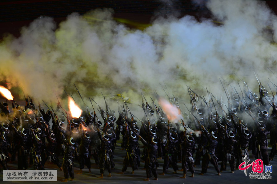 演员在贵州黔东南60周年州庆开幕式《大美黔东南?共圆中国梦》文艺演出中表演《岜沙雄风》。杨文斌 摄