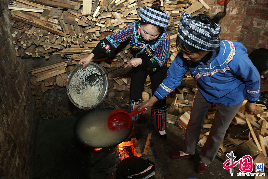 “三月三”一大清早,甘莱村村民杨梅和母亲韦马华烧起柴火,将泡好的糯米煮熟。张晖摄影