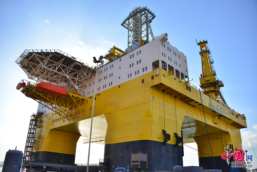 我国完全自主研发的“蓝鲸2号”超深水双钻塔半潜式钻井平台。