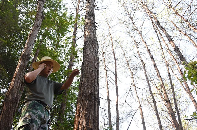 今年40岁有着18年党龄的彭红景是双峰县井字镇林业站的一名工作人员,1999年从部队退伍后就安排在乡镇林业站工作。在工作期间,彭红景参与了大小数次松毛虫防治战,如今他还奋战在防虫第一线。
