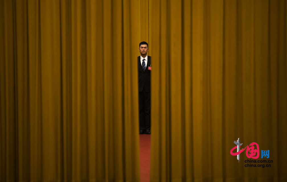 3月3日,全国政协十三届一次会议在北京人民大会堂开幕,图为大会堂一名工作人员。中国网 董宁摄影
