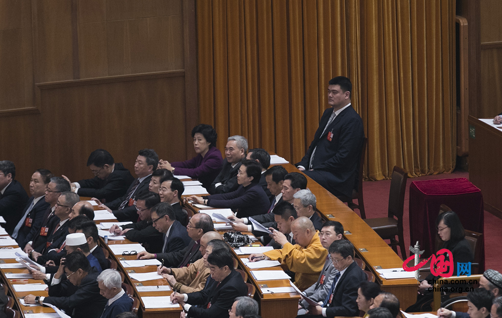 3月3日,中国人民政治协商会议第十三届全国委员会第一次会议在北京人民大会堂开幕。政协委员姚明在会议现场格外显眼。中国网 董宁摄影