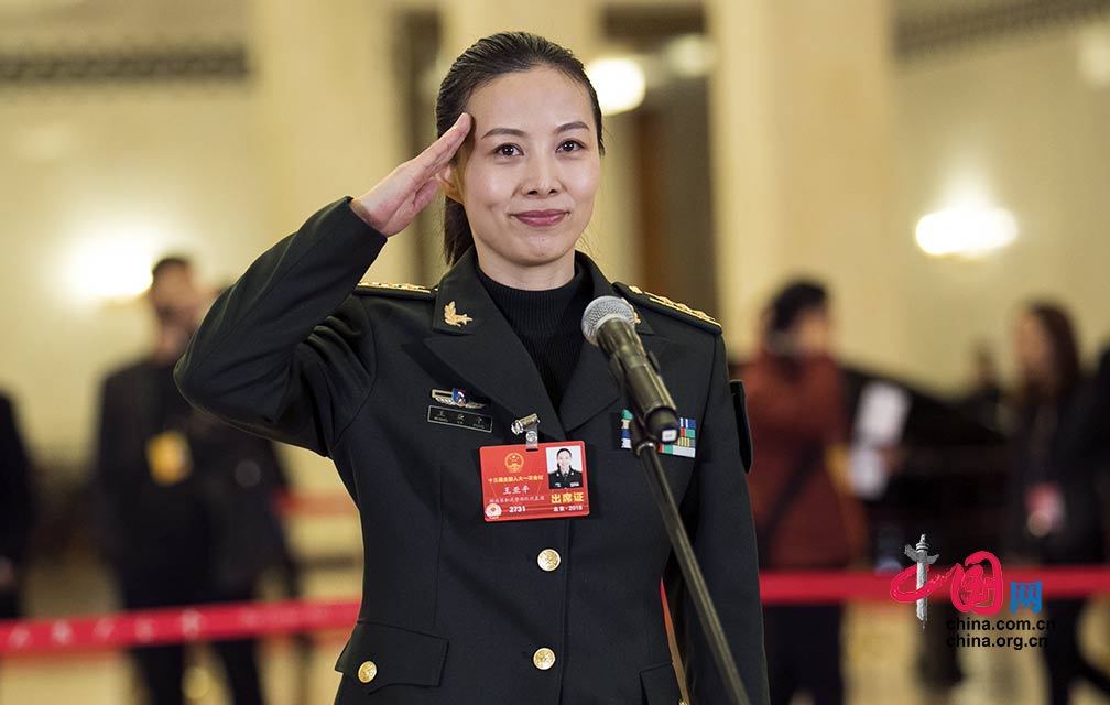 3月5日,中国人民解放军航天员大队副师职航天员王亚平代表在“代表通道”接受采访时敬礼致意。中国网 董宁摄影