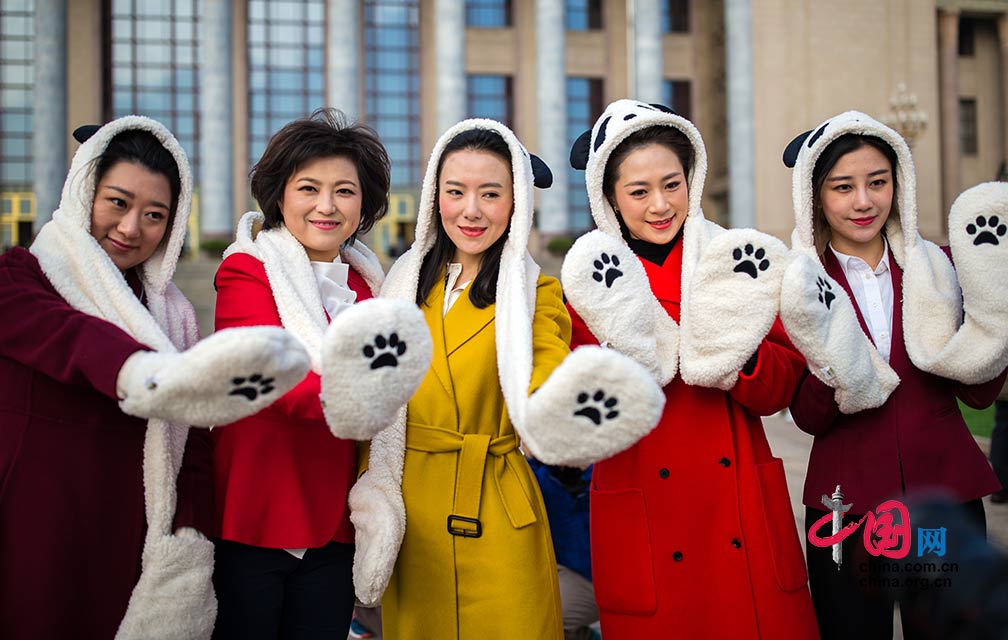 3月5日,十三届全国人大一次会议在人民大会堂开幕,黑龙江代表团女代表在大会堂之前合影留念。中国网 郑亮摄影
