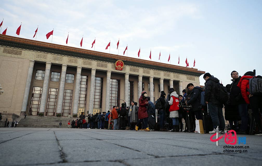 3月5日,天还没亮,参与十三届全国人大一次会议开幕式报道的记者在人民大会堂门前排起长队。中国网 杨佳摄影