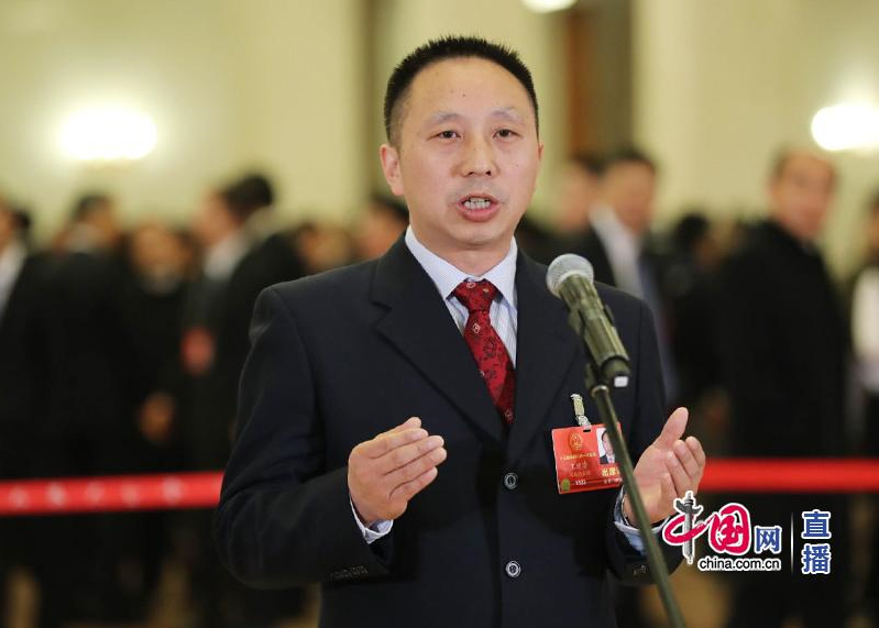 3月5日,十三届全国人大一次会议上午9时在人民大会堂开幕。首场“代表通道”集中采访活动开放,全国人大代表、东风商用车有限公司总装配厂调检一车间“王涛班”班长王建清接受采访。 中国网 董宁 摄影