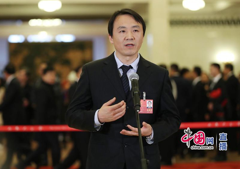 3月5日,十三届全国人大一次会议上午9时在人民大会堂开幕。首场“代表通道”集中采访活动开放,全国人大代表、中车青岛四方机车车辆股份有限公司转向架分厂钳工首席技师、中车首席技能专家郭锐接受采访。 中国网 董宁 摄影