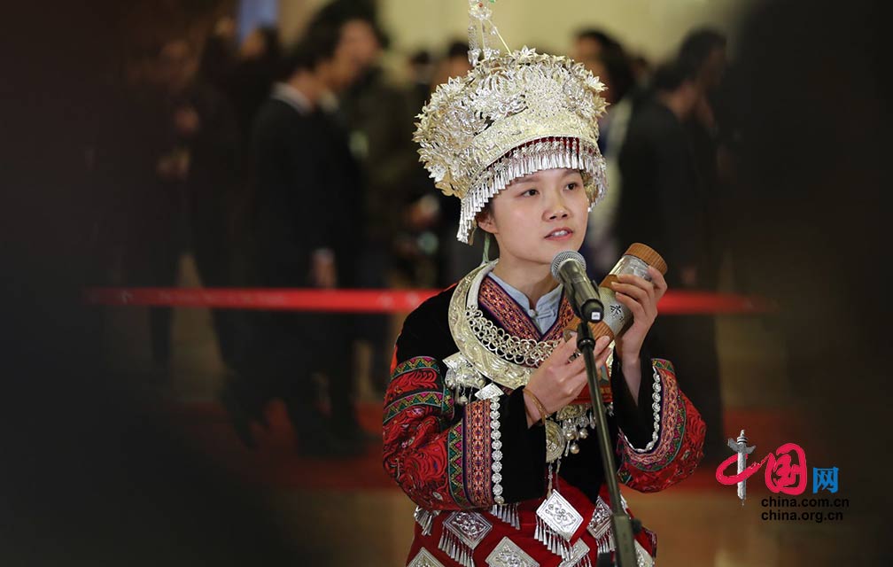 3月5日,贵州省人大代表杨昌芹用一个竹编水杯讲述少数民族农村脱贫致富的故事。中国网 董宁摄影