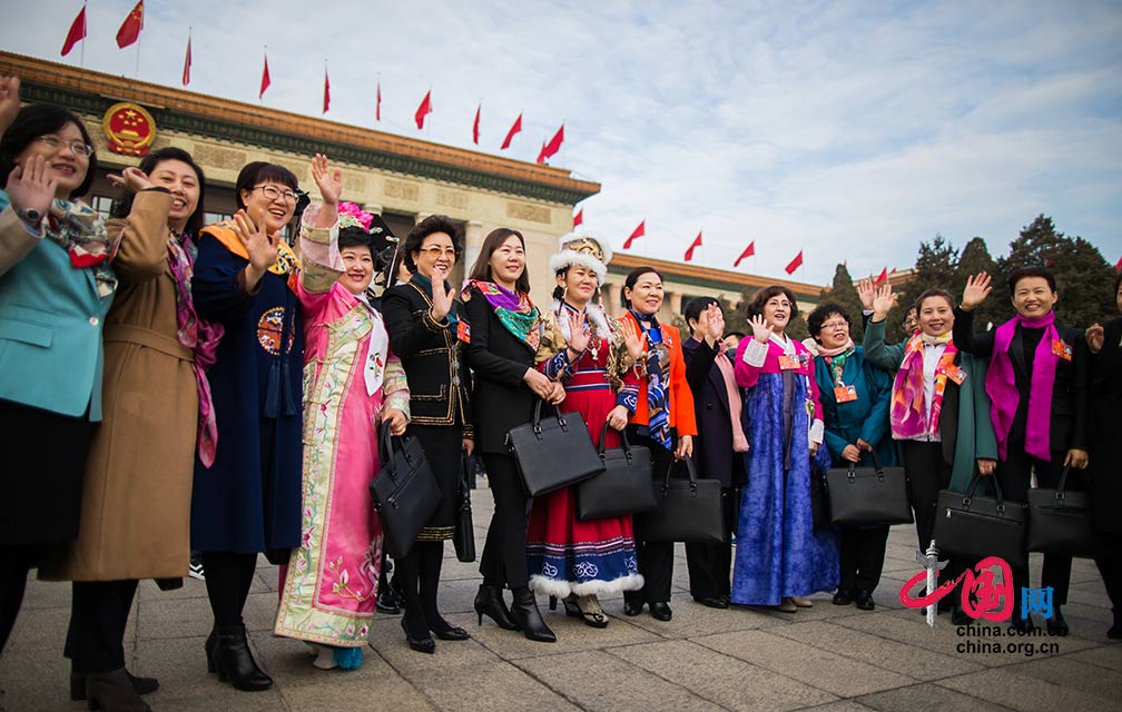 3月5日,十三届全国人大一次会议在人民大会堂开幕,黑龙江代表团女代表在大会堂前合影留念。中国网 郑亮摄影