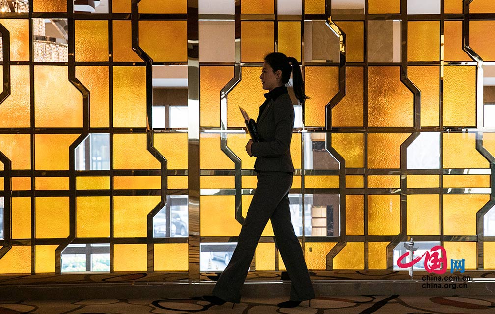 3月7日,一名工作人员匆忙走过,挺拔的身姿格外美丽。中国网 董宁摄影