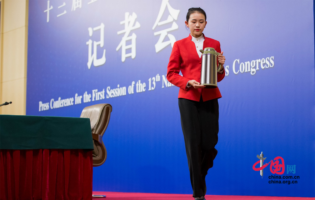 3月6日,人民大会堂工作人员为即将开始的记者会准备茶水。她们用细致耐心的工作态度服务两会。中国网 董宁摄影