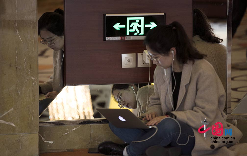 3月7日,一名女记者在政协委员驻地昆泰酒店席地而坐,紧张写稿。中国网 董宁摄影