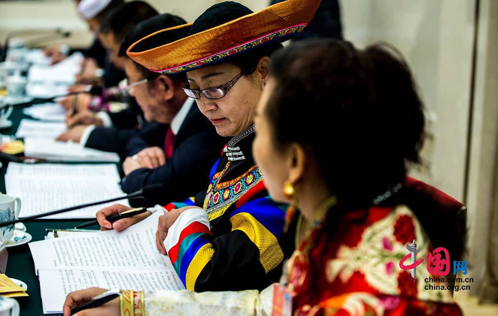 3月6日,身着少数民族服装的女代表在会场认真记录,十三届全国人大青海代表团代表21名,其中妇女代表4名。中国网 郑亮摄影