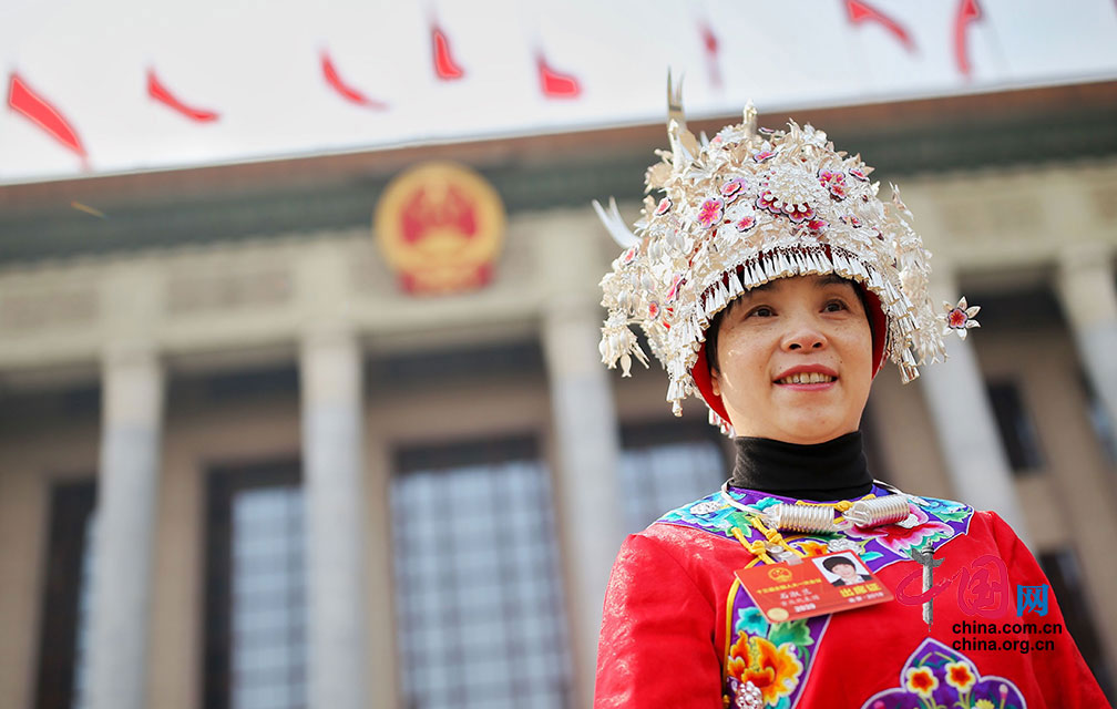 3月9日,十三届全国人大一次会议第二次全体会议召开。少数民族代表总是人民大会堂前的靓丽风景线。中国网 郑亮摄影