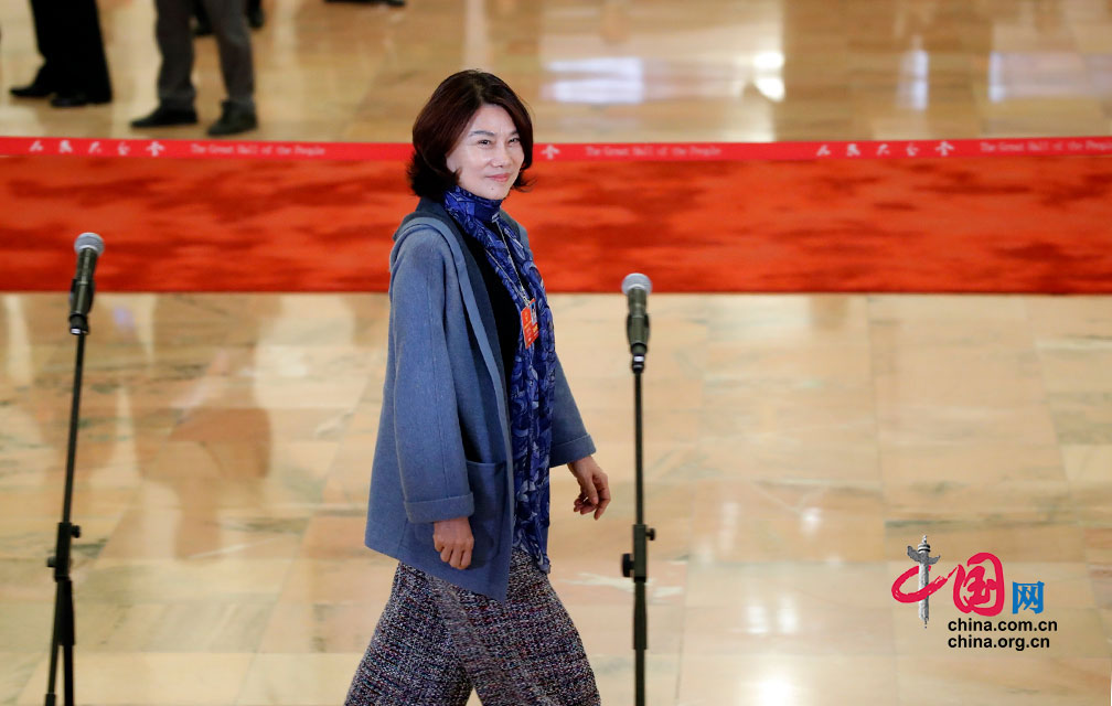 3月9日,十三届全国人大一次会议第二场“代表通道”董明珠代表接受记者集体采访。中国网 杨佳摄影