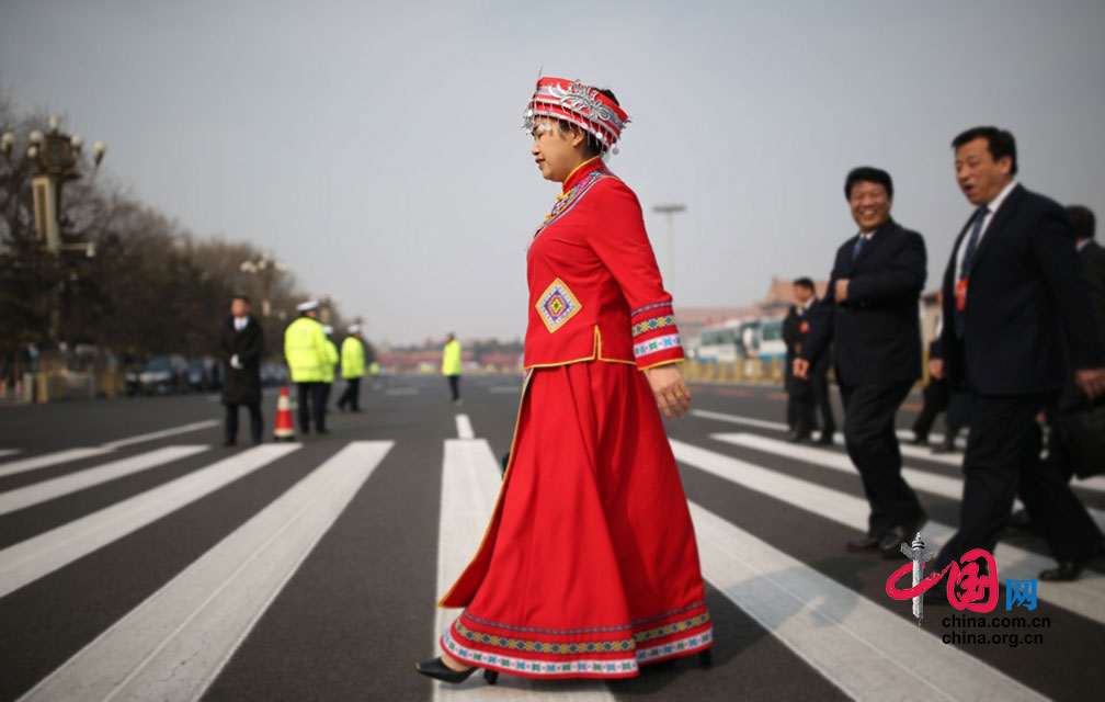 3月9日,十三届全国人大一次会议第二次全体会议召开。一名少数民族代表走过斑马线。中国网 郑亮摄影