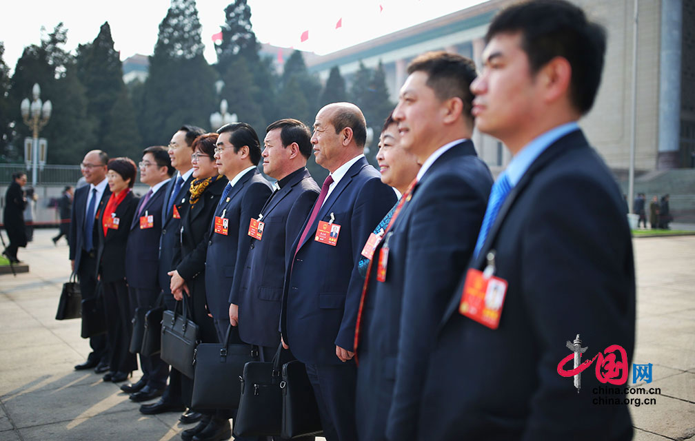 3月9日,十三届全国人大一次会议第二次全体会议召开。河北团代表在人民大会堂前合影。中国网 郑亮摄影