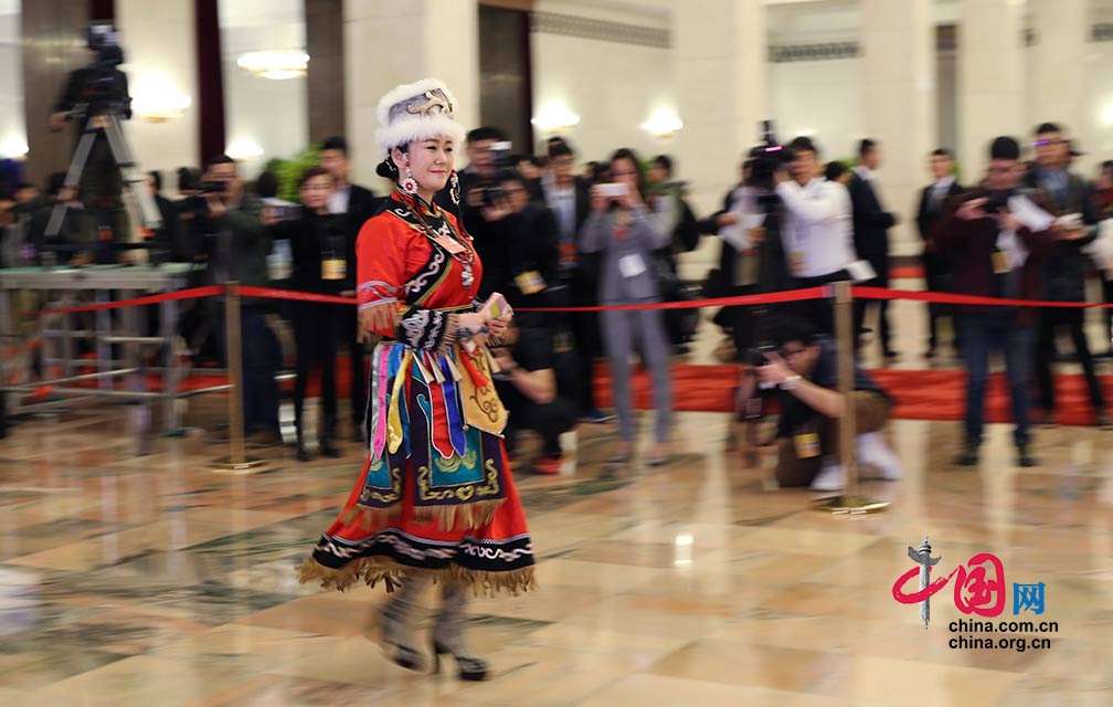 3月11日,第三场“代表通道”上来自赫哲族的全国人大代表刘蕾穿戴着赫哲族特有工艺制作的鱼皮帽和鱼皮靴。中国网 董宁摄影